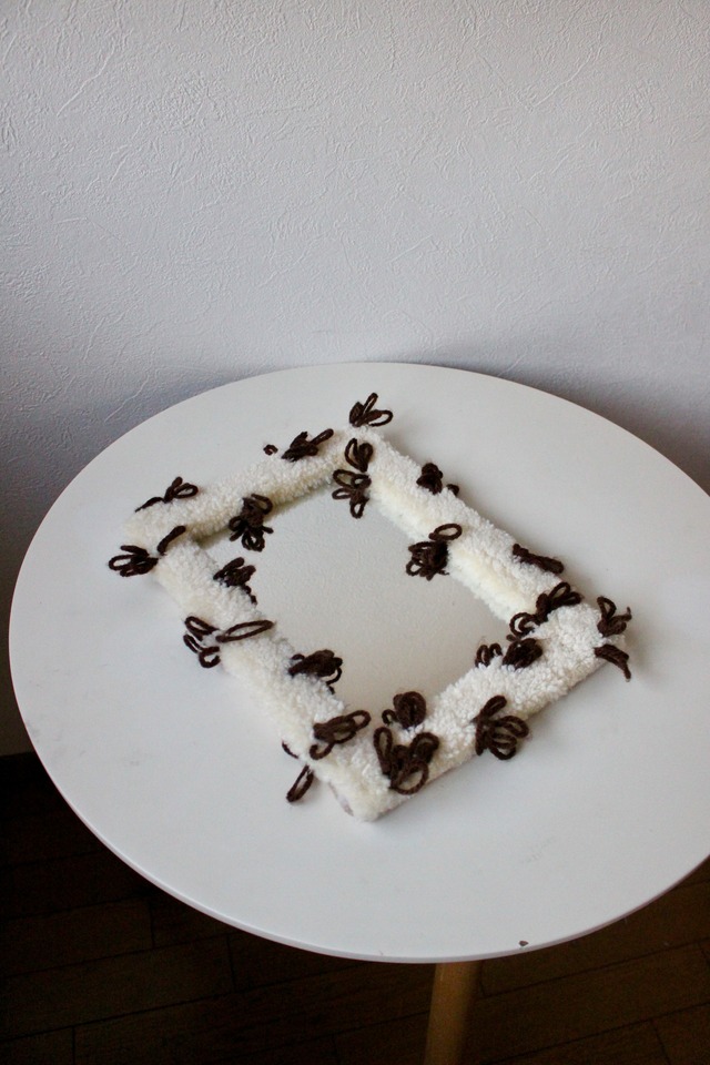 Rug mirror small . 好きな場所に、好きな時に、好きな様に使っていただきたいという思いを込めて…. お部屋を明るく見せるアイテム♡ 発色が良くインスタ映えもします♪ 【サイズ】31cm×22.8cm ※多少の誤差がございます。 【カラー】white×blown 【商品説明】 鏡、小物置きとしてお使いいただけます ◆ご注文前に必ずお読み下さい。 ご理解いただいたお客様へ配送させて頂きます。 ・お使いの端末によっては色の見え方が多少異なる場合がございます。 ・アクリル毛糸を使用している為お洗濯はお控えください。 ・汚れた際は薄めた中性洗剤で丁寧にお拭き取り下さい。 ・毛糸が飛び出た場合はハサミでカットして下さい。 ・重いものを乗せると毛糸の潰れの原因になりますのでお控えください。 ・床面の状態によっては滑る場合がございますので滑り止めシート等と併用をお勧めしております。 ハンドメイドとタフティングの特性をご理解の上ご購入いただき、ご購入後の返品、交換はお受付できません。 ラグマット ラグ タフティング ハンドメイドラグ ウォールアート ラグミラー